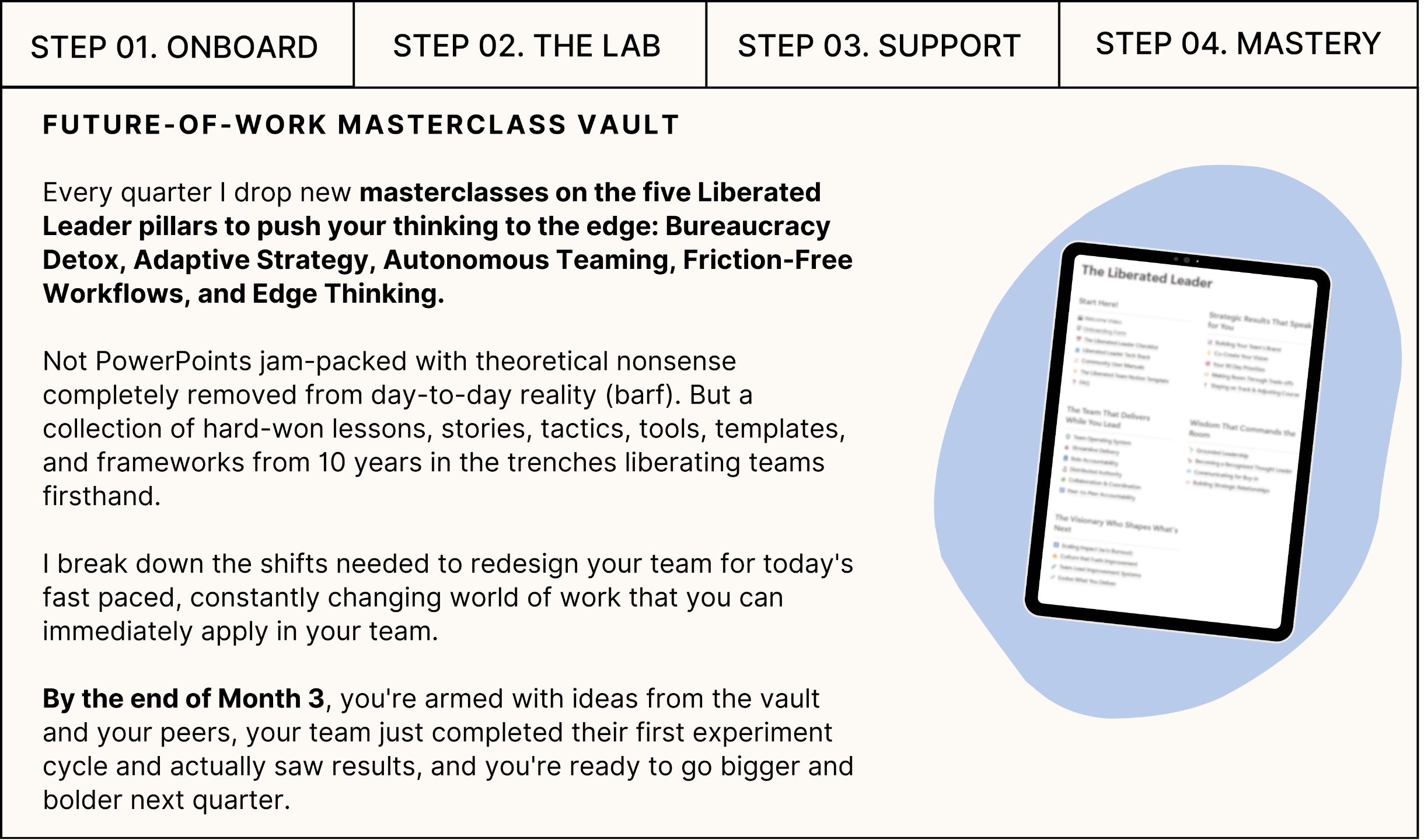 Each quarter, I drop new masterclasses on the core shifts to future-proof your team for today's fast-paced, constantly changing world. Through lessons, tools, templates, and peer discussions, you're fully equipped to take what you learn and immediately experiment with it in your team.